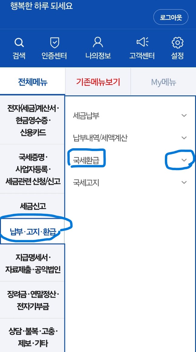 - '국세환급금찾기' 옵션을 선택하여 본인의 환급금 여부를 조회합니다.
