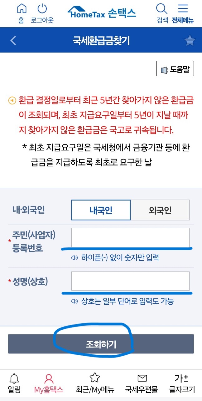 - 환급 결정일로부터 5년 이내에 찾아가지 않은 환급금은 국고로 귀속되므로, 기간 내에 반드시 수령하시기 바랍니다.