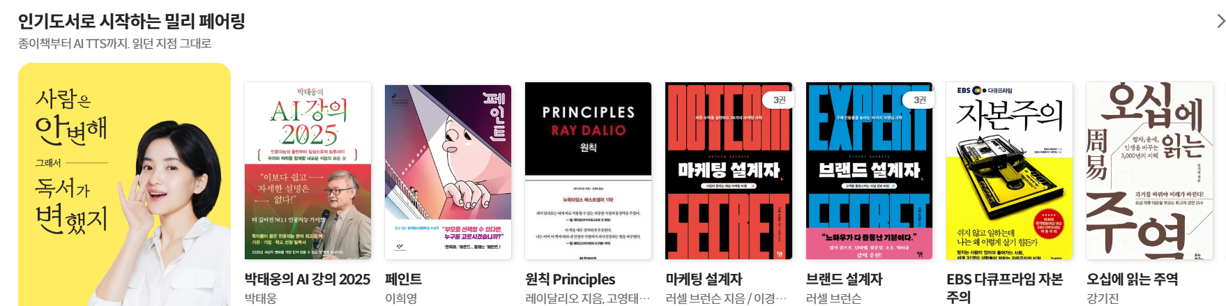 - 밀리의 서재: 약 15만 권의 방대한 전자책과 오디오북을 보유하고 있으며, AI 음성을 활용한 오디오북이 특징입니다.