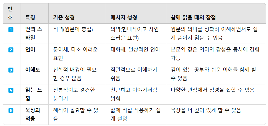 메시지 성경은 기존 성경과 함께 곁들여서 읽으면 훨씬 더 풍부하게 성경의 내용을 적용하고 풍성한 은혜를 누리실 수 있을 거에요. 한번 도전해보시면 좋겠습니다.