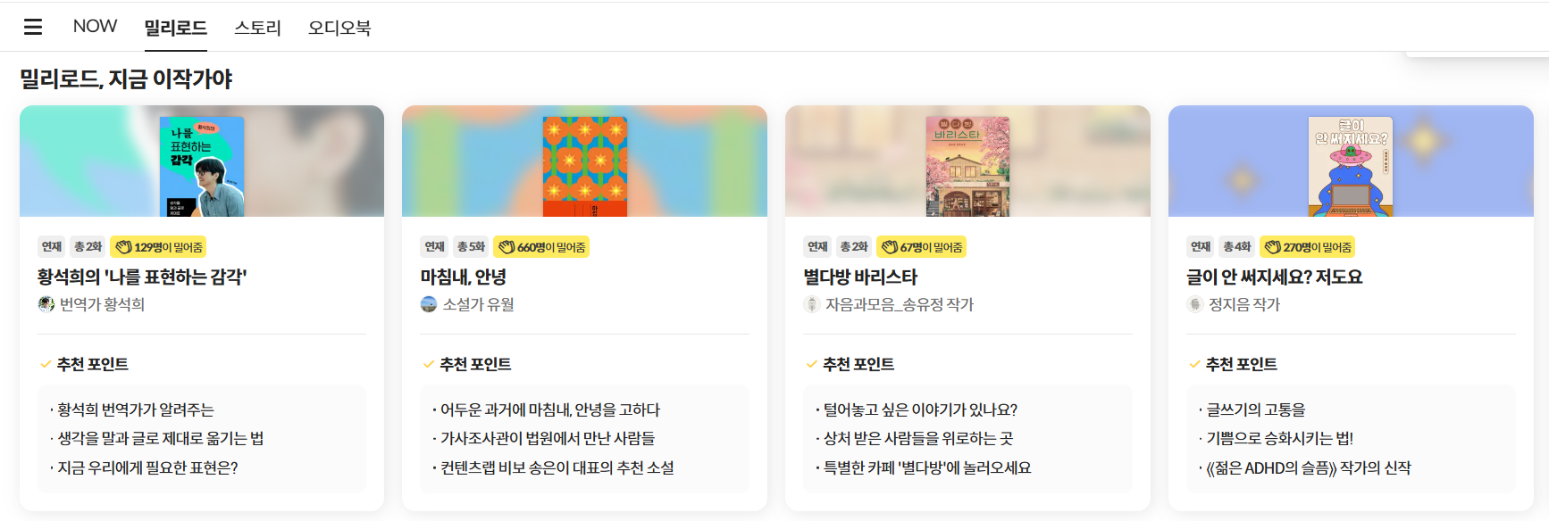 밀리로드라는 곳을 알게 되었습니다. 전에 밀리의 서재에서 연간구독을 한 경험이 있었는데, 밀리로드는 글쓰기 플랫폼인데 진입장벽이 없어서 글이나 그림을 올려보고 사람들의 평가를 받아보기에 좋습니다.
