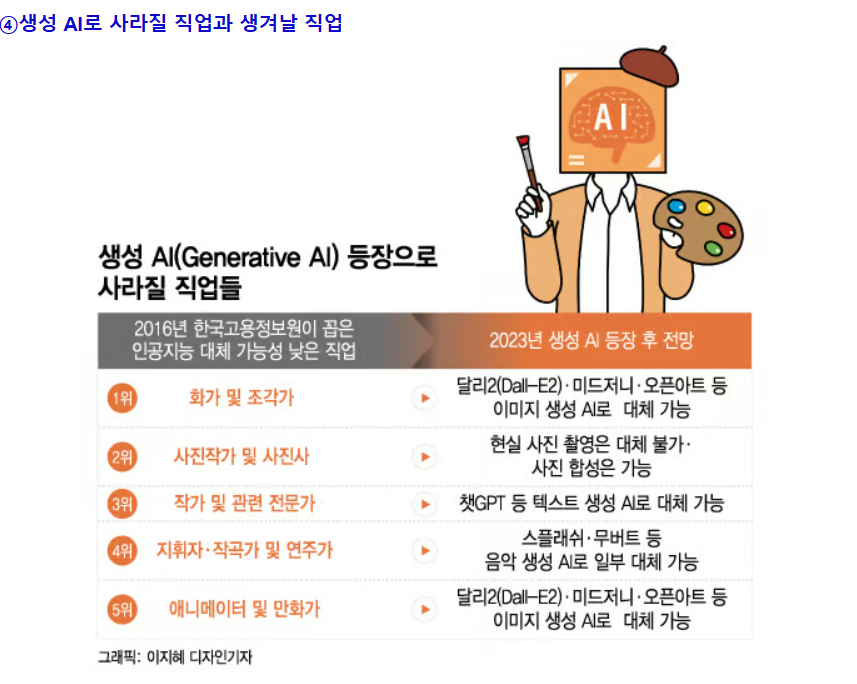 이러한 변화에 대비하여 새로운 기술을 습득하고, 창의력과 감성을 필요로 하는 분야로의 전환을 고려하는 것이 중요합니다. 이미 은행에서도 카페에서도 안전해주고 결제해주거나 정보를 제공해주는 인력들이 사라지고 있습니다.