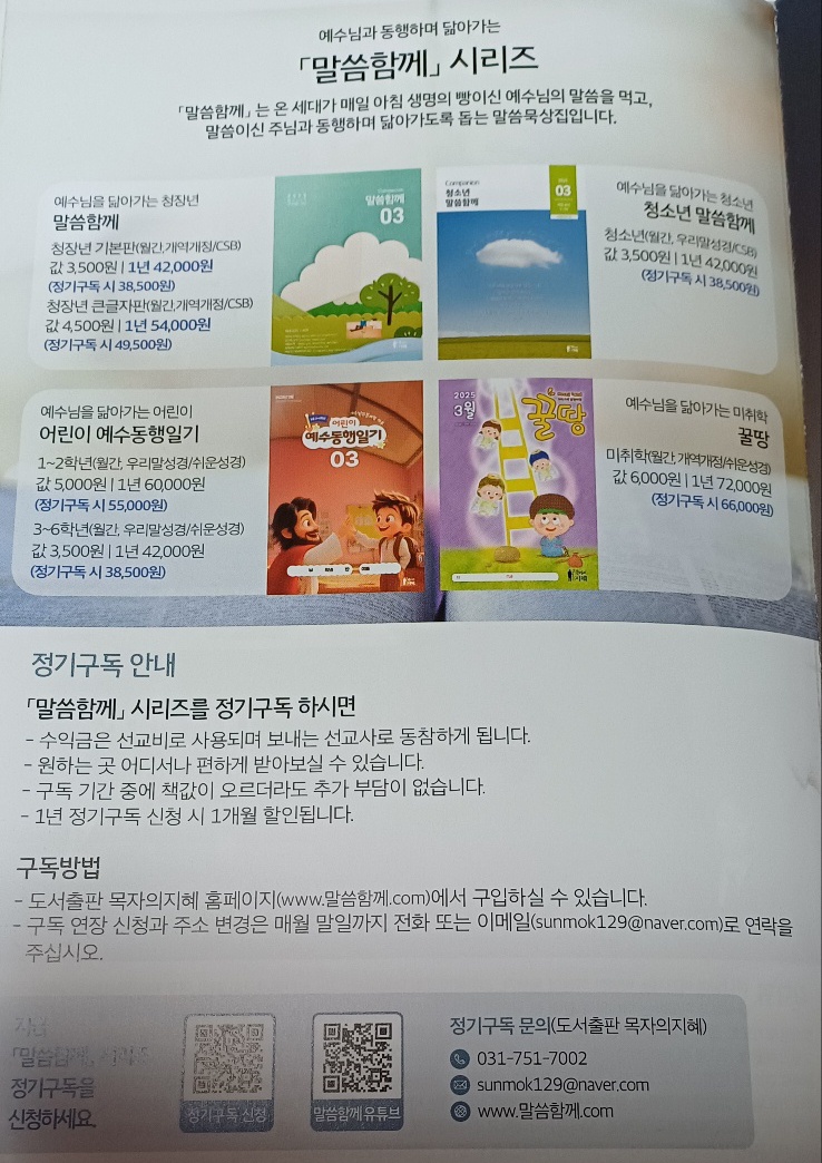 우리 속회도 이것을 가지고 나눔을 합니다. 한달에 3,500원으로 구입이 가능하지만 연간 구독을 하면 1개월분을 추가로 받을 수 있다고 해요. www.말씀함께. com  에서 구입하실 수 있고 구독 연장 신청과 주소 변경은 전화(013-751-7002) 또는 이메일(sunmok129@naver.com) 로 연락을 하면 됩니다. 저도 작년에 이어 올해 1년 구독 연장을 신청했어요.